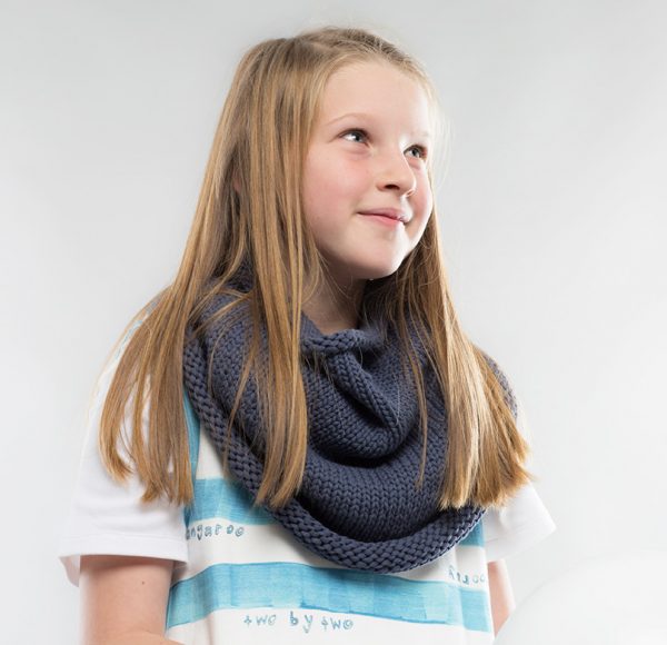 The child’s snood scarf / neck warmer is worked in chunky knit yarn on a set of double pointed needles or a circular needle.