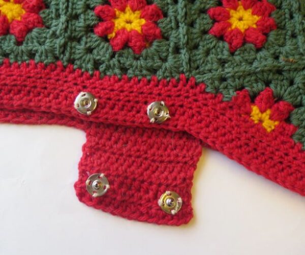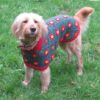 The coat is shaped to lie neatly over your dog’s back and fastens securely with a band under the tummy. It’s decorated with Christmas-themed floral squares, but you can use any colours you like.