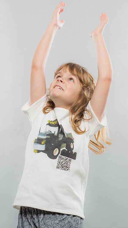 The fabric print contains a QR code. This links to the Lego construction plans for your kids to build the brick truck. The other side of the T shirt